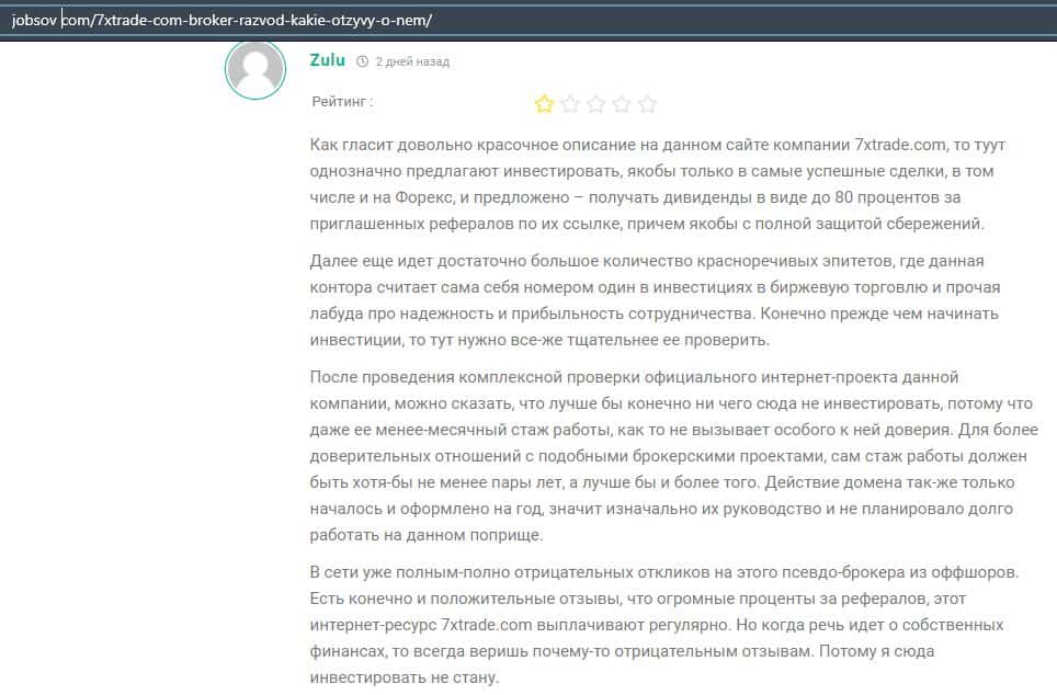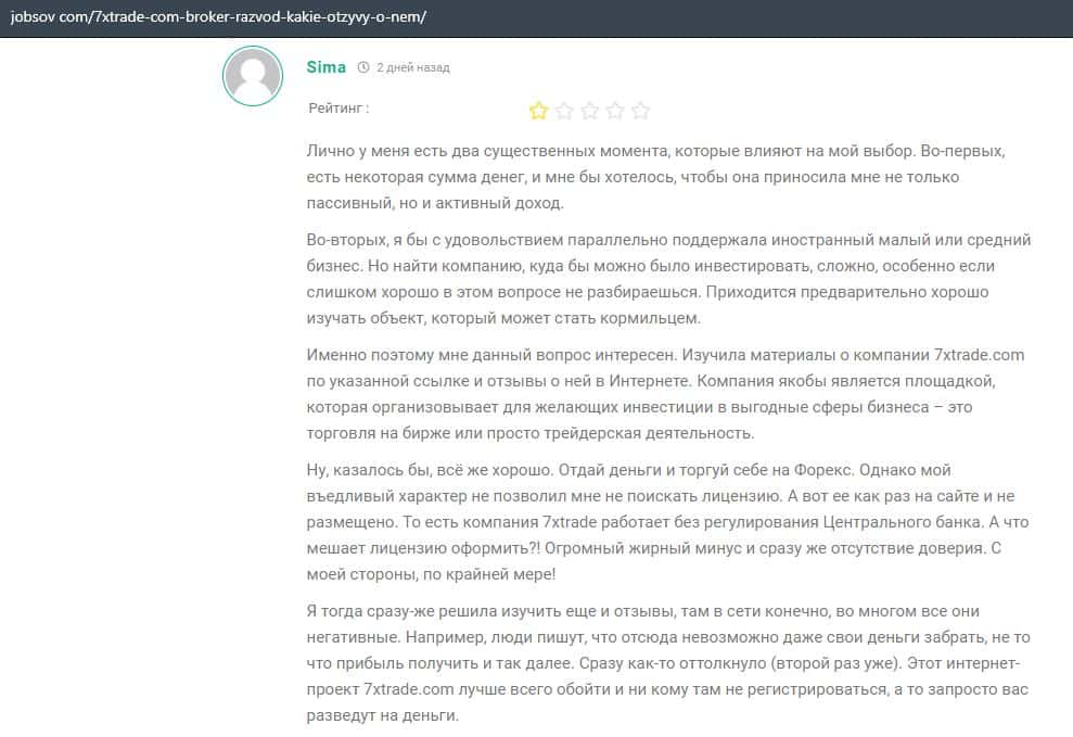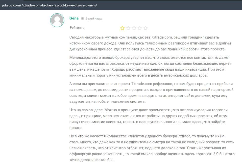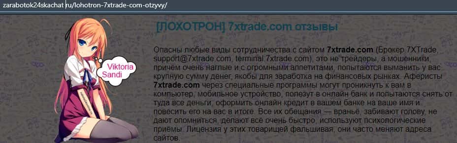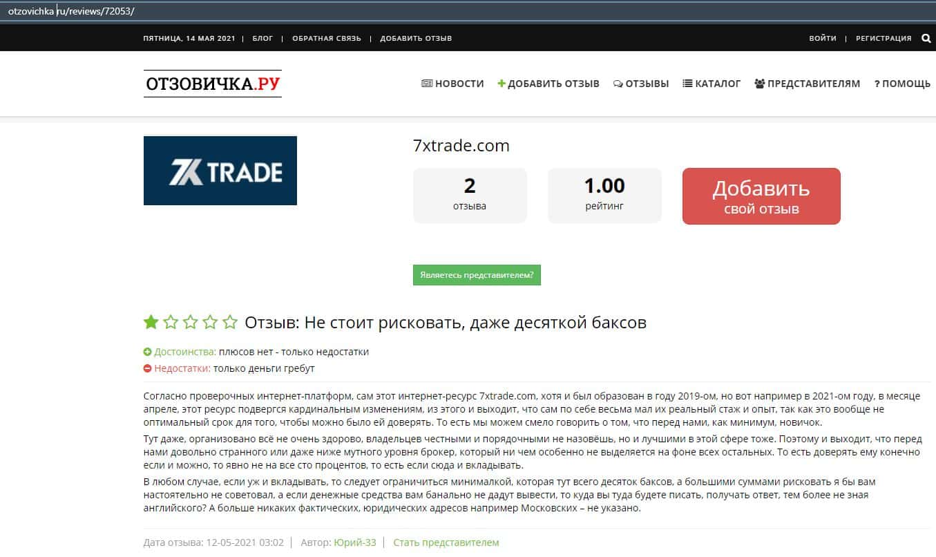 Лохотронская контора 7XTrade попала в обзор еще портала, где в подробностях описывается информация, что есть большая вероятность, что вас там обманут на деньги.