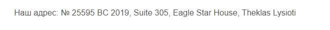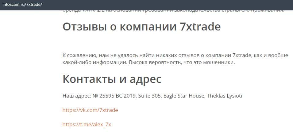 Далее представлена контактная информация мошеннической организации 7ХТрейд. На своем ресурсе из прямых контактов можно только найти адрес оффшорной регистрации: