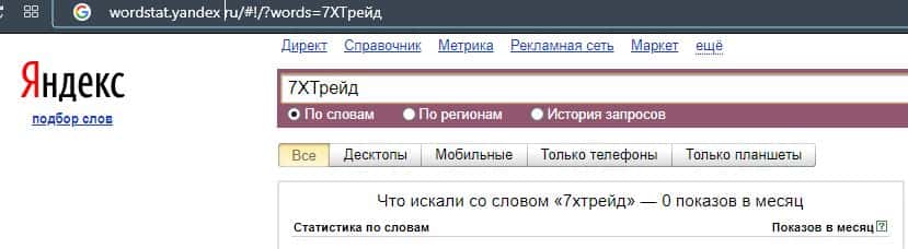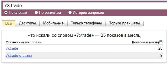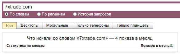 По поводу поиска сайта лохотрона по бренду его официального сайта "7xtrade.com", то значения показов в поисковой системе Яндекс насчитывают 4 показа за месяц.