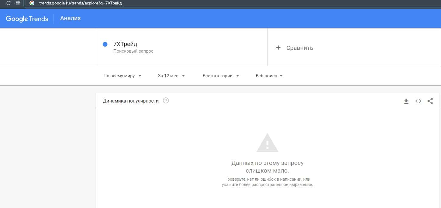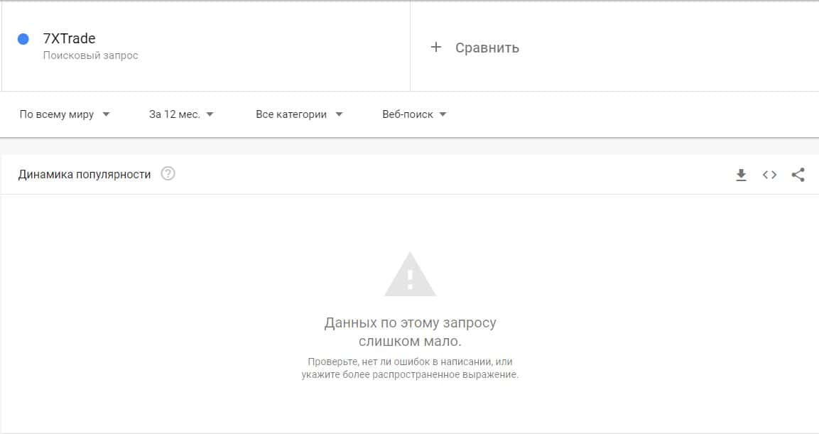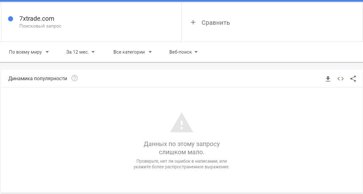 Бренд сайта "7xtrade.com" все-таки не ищется в поисковой системе Гугл и не было совершено ни одного запроса по статистике системы Гугл Трендс.