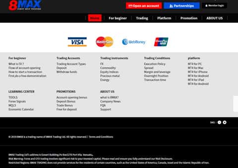 Завершается же сайт у мошенников 8MaxTrading довольно ожидаемо и стандартно, а именно стандартным меню со ссылками на различные разделы сайта аферистов 8 Макс Трейдинг, а так же предупреждением о рисках, в котором лохотрон 8MaxTrading предупреждает о вероятности слива средств. Ниже вы можете увидеть окончание сайта мошенников 8 Макс Трейдинг.