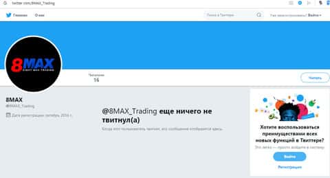 Имеется у жуликов 8MaxTrading и страница в социальной сети Twitter, где аферисты 8 Макс Трейдинг имеют довольно малое количество подписчиков, и аналогично предыдущей странице не постят никаких записей на своем аккаунте, что уже смахивает на определенную халтуру в исполнении жуликов 8MaxTrading. Ниже вы можете наглядно увидеть страницу аферистов в Твиттер.