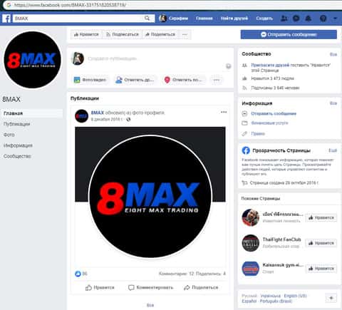 Дабы соответствовать современным трендам мошенники 8MaxTrading обзавелись страницами в социальных сетях, одной из которых стал Facebook, где аферисты 8 Макс Трейдинг имеют несколько тысяч подписчиков, однако не постят никаких записей, что наталкивает на мысль о том, что страница была создана шулерами 8MaxTrading исключительно для галочки.