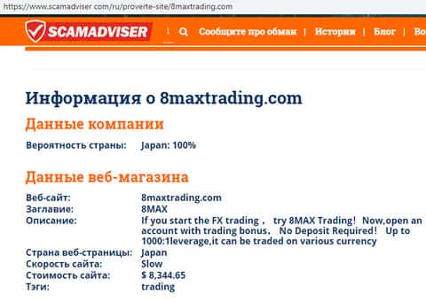 В связи с мошеннической и противозаконной деятельностью мошенников 8MaxTrading их руководители предпочитают анонимность дабы избежать ответственности со стороны правоохранительных органов. Информацию о самом сайте аферистов 8 Макс Трейдинг можно узнать с помощью портала scamadviser com, которую вы можете увидеть на изображении ниже.