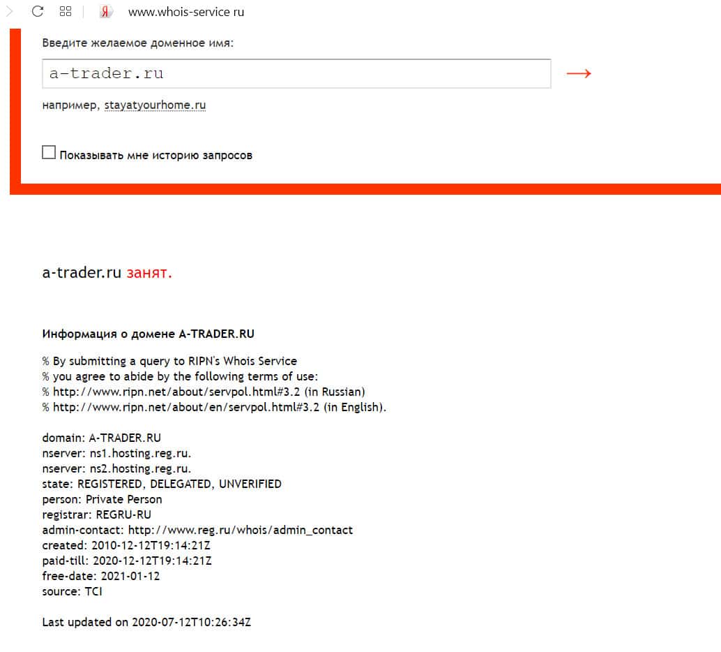 Кому принадлежит доменное имя сайта a-trader ru?