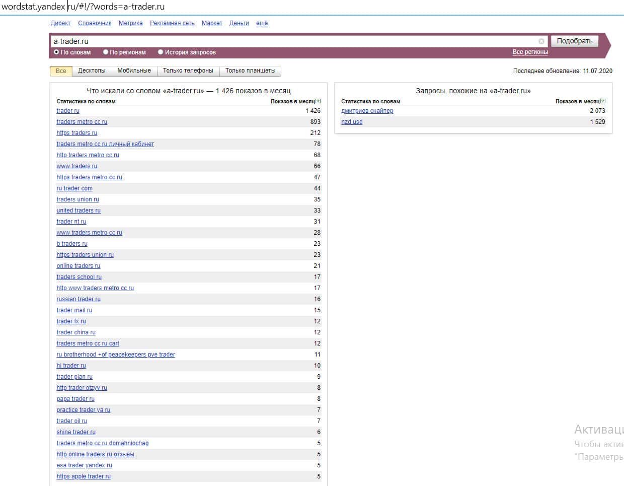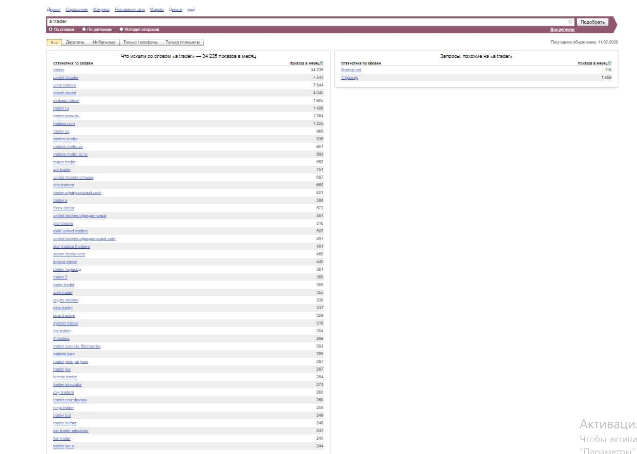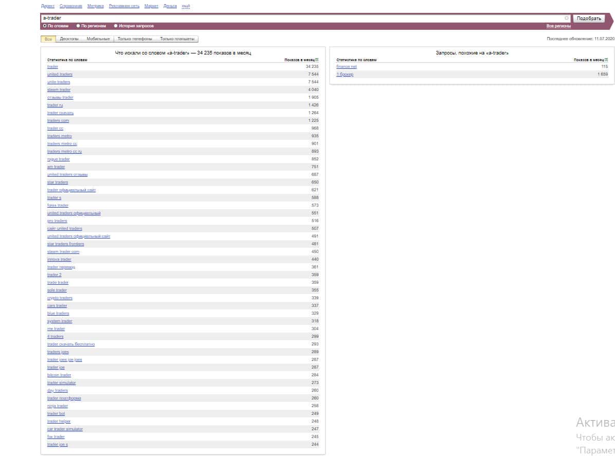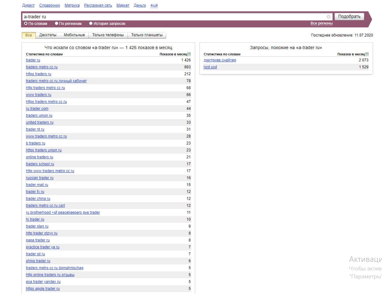 То же название "a trader", но написанное с пробелом, люди пытались найти в системе Яндекс аналогичное количество раз: 34 235.