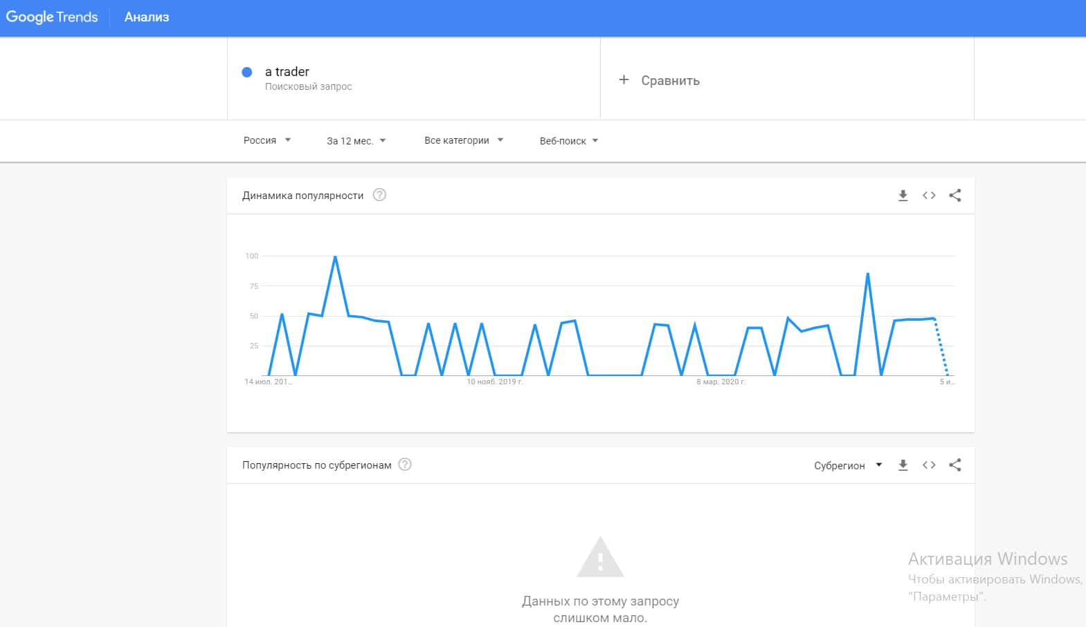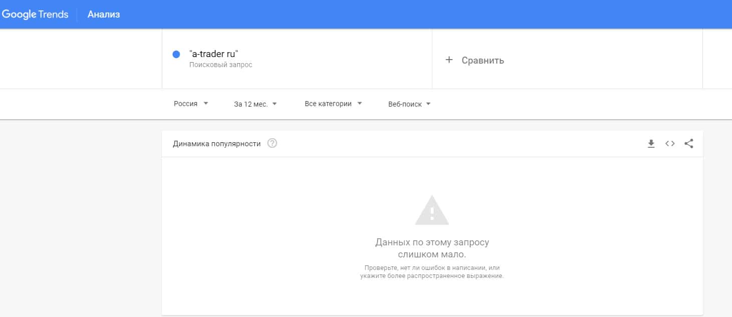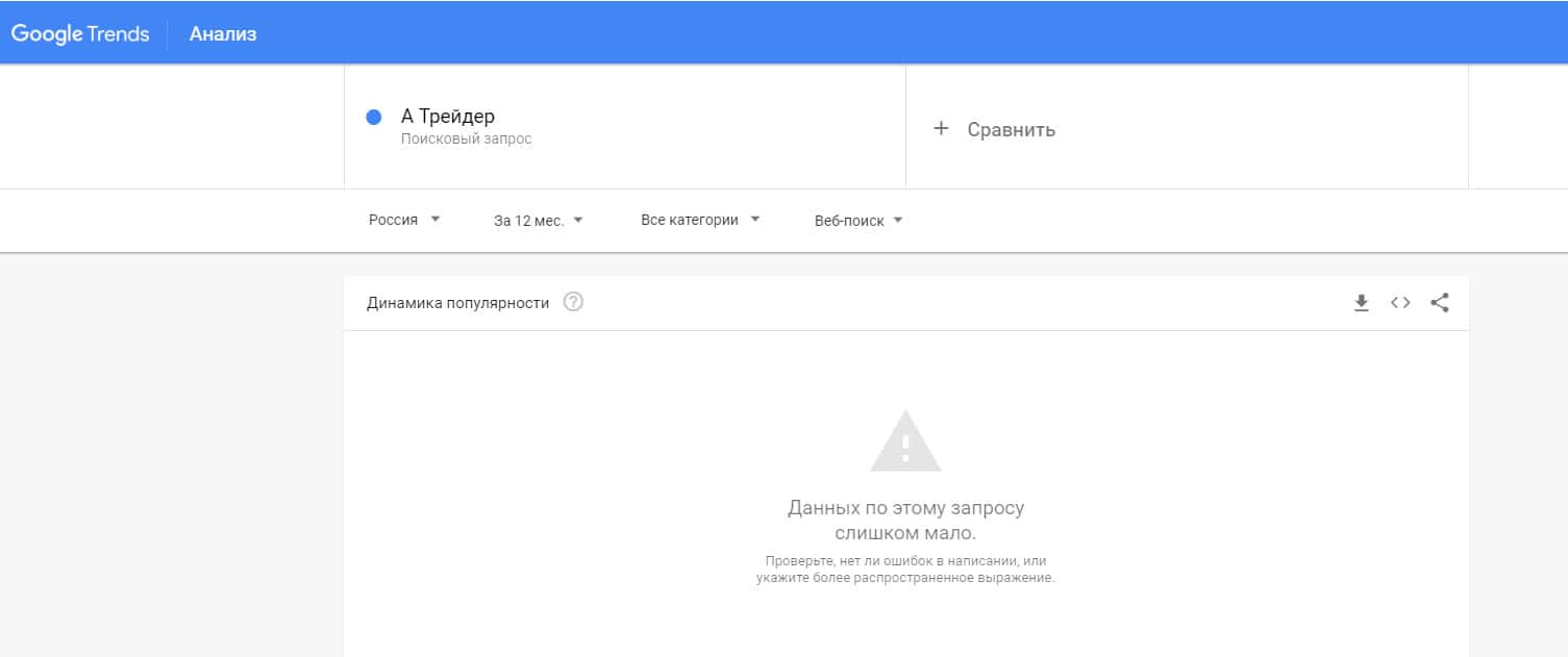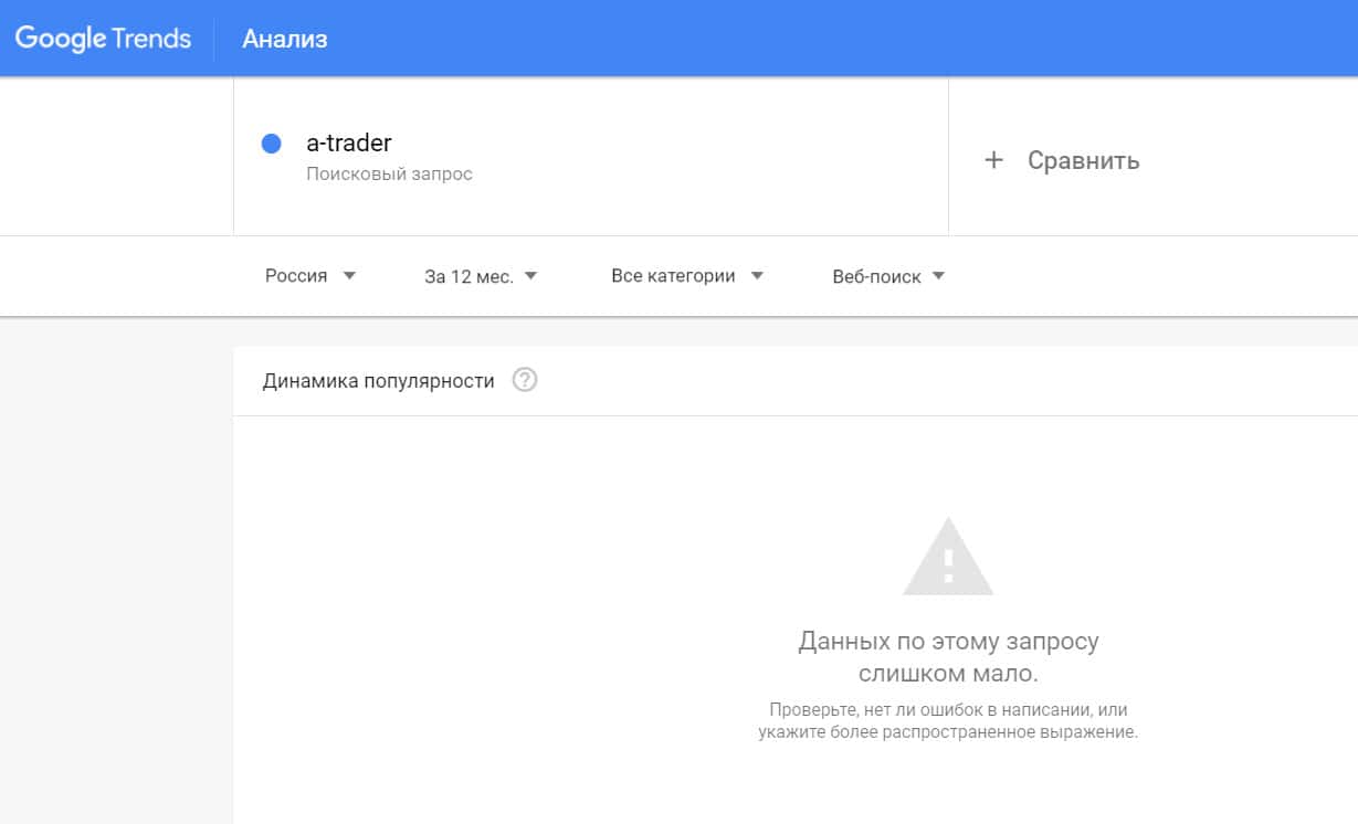 Посмотрим, насколько популярно название бренда "A-Trader", написанное на английском языке. Данных по этому запросу нет, так как никто не искал этот бренд в Гугл.