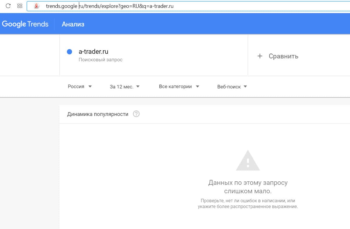 Количество запросов по домену "a-trader ru", вбитого в поисковик Гугл без точки, столько же, то есть, очень мало.