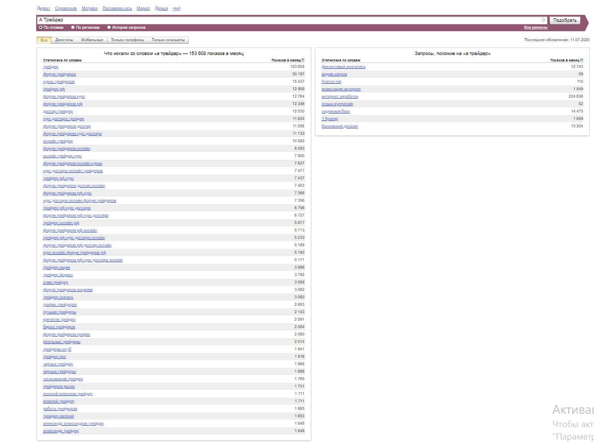 Посмотрим, сколько раз люди искали название бренда "А Трейдер" на русском языке. Результат очень высокий: 153 603 раза. На самом деле это связано со понятием трейдер.