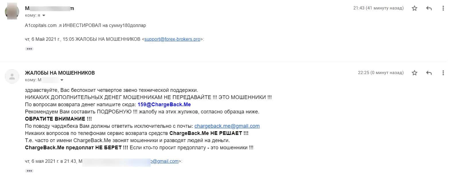 На почтовый адрес сайта по сбору информации о деятельности мошенников Форекс пришла жалоба на обманщиков А1 Капиталс, которые развели клиента на 250 $ США.