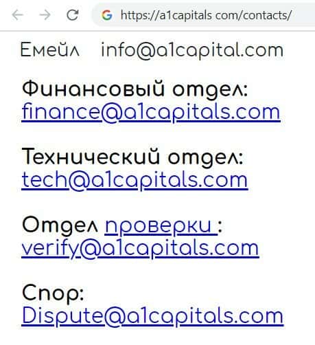 Так же контора жуликов А1 Капиталс указала контактные адреса электронной почты, через которые поддержка лохотрона продолжает разводит наивных пользователей. Почта: