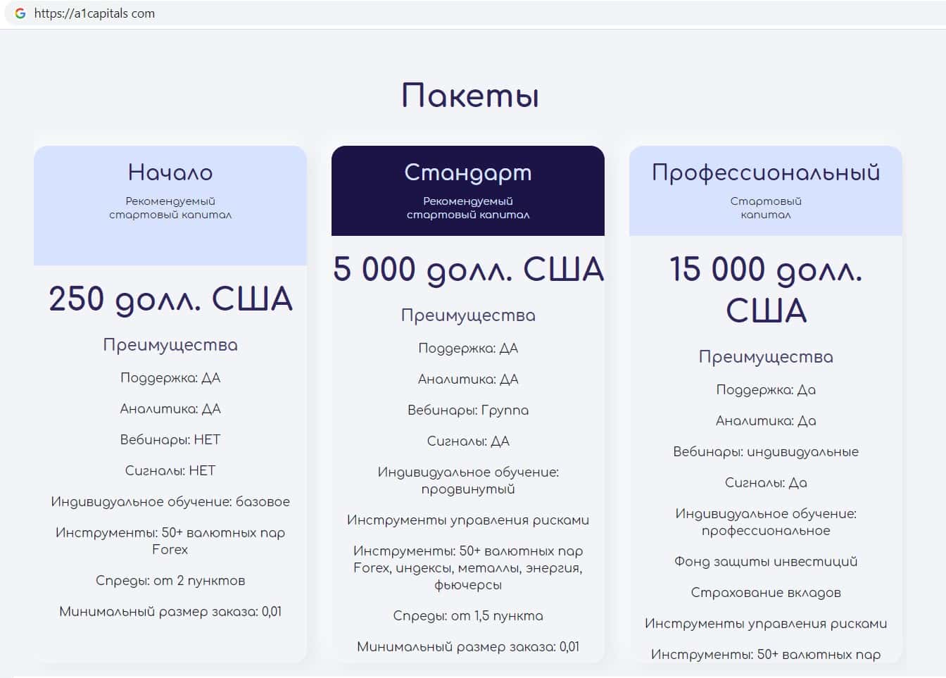 Чтобы начать сотрудничать с лохотроном А1 Капиталс пользователь должен выбрать 1 из 3 счетов, минимальный депозит которых варьируется от 250 до 15000 долларов.