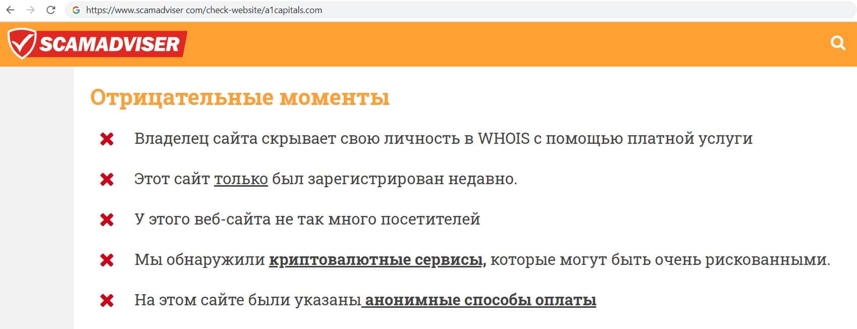 - Мнение онлайн-сервиса scamadviser com о сайте мошенников А1 Капиталс