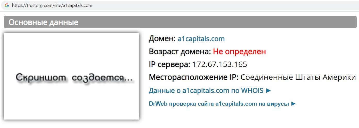 - Информация о возрасте главного сайта мошенников А1 Капиталс