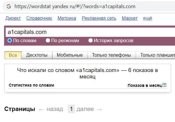 Проверили мы и количество запросов конторы жуликов A1Capitals по русскоязычному названию фирмы, а именно "А1 Капиталс", но данный запрос пользователи не совершали.