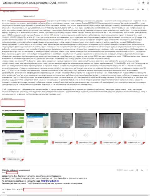 Один человек уверяет, что аферисты дилинговой кухни А1-Trust поступили с ним не честно и своровали порядка 4000 долларов, которые заставили взять в кредит. Чтобы разрулить данную ситуацию, ему посоветовали написать в организацию ChargeBack.Me которая как раз специализируется в таких случаях. Ведь деньги еще лежат на счете, пообещали вернуть 4 месяца, но сделать сам, жертва, ничего не может.