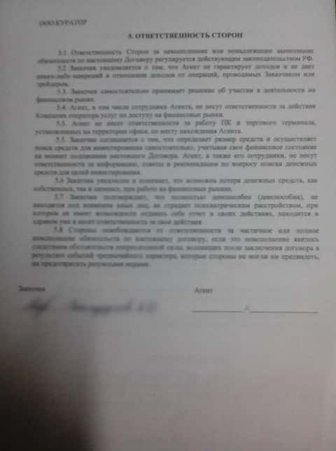 Дальше можно посмотреть ответственность сторон договора, в котором аферисты A1-Trust сваливают всю вину на клиента в случае провала.