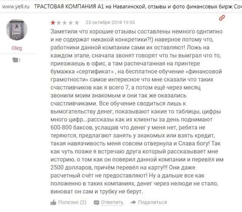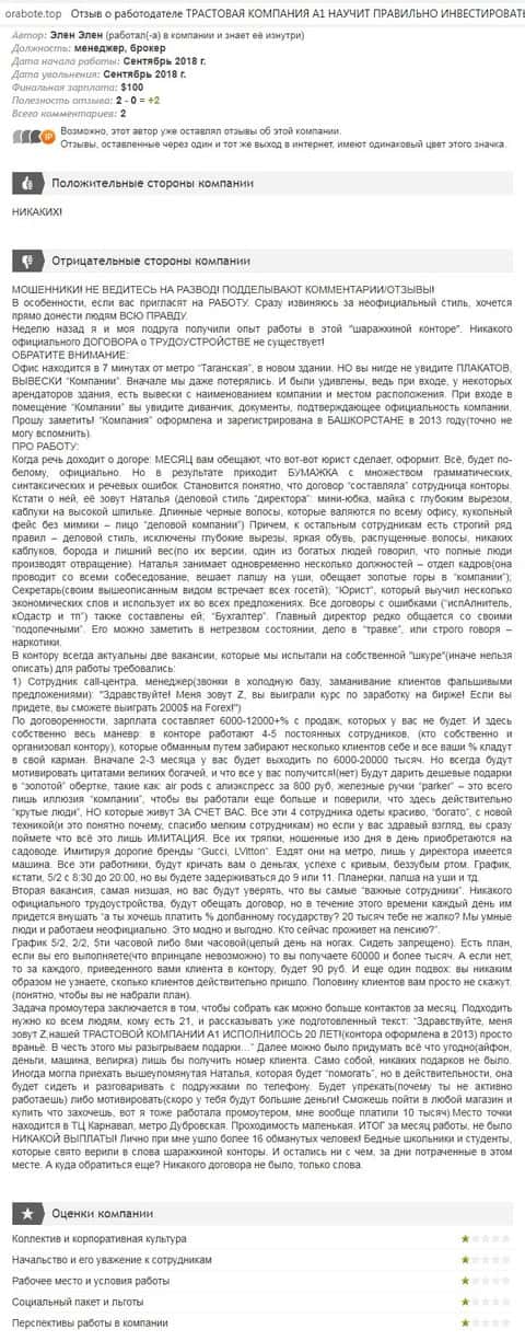 На сайте orabote top был оставлен очень подробный отзыв, обличающий жуликов А1 Траст как нельзя лучше. Можно ли спокойно утверждать о их как минимум нейтральности, когда полный отзыв говорит об обратном. Когда десятки людей, доверившись этим жуликам, позже уходят ни с чем. Мало этого, все до одного отзывы (как позитивные, так и негативные) показывают одну простую вещь – вкладывают деньги клиенты не с помощью A1-Trust, а в саму А1 Траст! Ни о каком консалтинге по факту не может идти и речи. Это лишь слова. Одни из многих, которые используют мошенники для отмывания своей репутации. Извините, но такое уже не отмоешь.