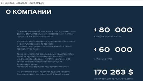 А1 Траст – очередной мошенник на просторах Сети. Позиционируя себя как консалтинговая компания, A1-Trust являются ни чем иным, как Интернет-разводилой, который, используя покупные отзывы и жадных к деньгам звонарей разводят клиентов на деньги не первый месяц, и будут делать это до тех пор, пока доверчивые клиенты будут отдавать им средства. С концами. Данные мошенники крайне ушлые, сливают они своих клиентов в NPBFX, а у самих как будто рыльце в пушку. Это чистой воды мошенничество господа, направлять людей на сайт мошенников. Ни в коем случае не доверяйте свои средства мошенникам А1 Траст!