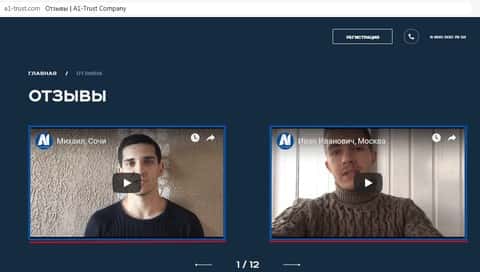 На сайте А1 Траст также имеются отзывы. Даже записанные на видео. Что же, рассмотрим. Про такие мелочи как зачитывание раннее записанного текста говорить не будем. Стоит лишь сказать о главном, чтобы все сомнения отпали. Первое, истинность как этих отзывов, так и других позитивных отзывов на разных сайтах. Кучи клишированных строк по типу: "Научили, качественно, надёжно, торгую на бирже". Без преуменьшения, информативности в данных отзывах не больше, чем в прошлом предложении. И хоронит все эти отзывы только один вопрос: на каких биржах? Именно так, ни в одном комментарии, ни в одном видео отзыве не указаны биржи, на которых так славно поднимаются наши гаврики.