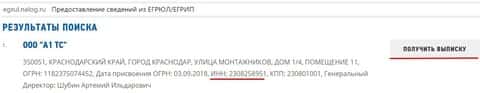 Выше представлены данные, которые были даны на сайте А1 Траст. Других данных, в том числе и о руководстве на сайте данной конторы попросту нет. Можно пойти другим путём и найти данные по этой конторе через её ИНН (идентификационный код налогоплательщика). Делается это через сайт ergul nalog ru.