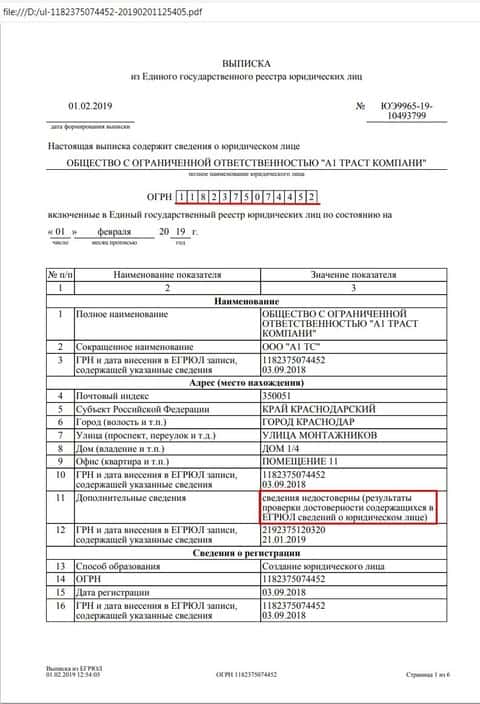 Далее можно получить выписку и посмотреть данные о конторе А1 Траст. Тут начинаются интересные вещи. Предположим, что данная компания действительно принадлежит жуликам A1-Trust. Что это действительно они те, кто её зарегистрировал. Ладно, тогда у нас появляются еще более интересные вопросики. Получив выписку, мы действительно видим данные ИНН и ОГРН, указанные нам в письме. Но вот то, что находится внизу страницы выписки в очередной раз подтвердило наши подозрения к принадлежности конторы А1 Траст к разряду мошеннических. Надпись в выписке "сведения недостоверны", что также является ярким признаком компаний-однодневок, которыми и являются наши гаврики A1 Trust.