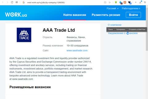 Конторе АААТрейд в городе Киев явно не хватает сотрудников, что очень сильно отражается на работе самого диллингового центра, поэтому они зарегистрировались на всех площадках, работающих с украинской аудиторией, которые ищут сотрудников для компаний. Одна из таких платформ - rabota ua. Тут опять же находится пользователь "AAATrade", представленный, как заказчик.Главный офис мошенников АААТрейд в Кипре ищет HR manager