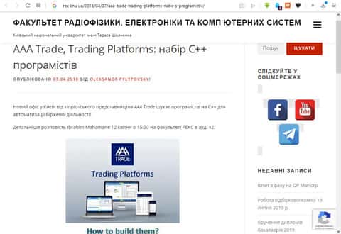 На сайте КИУ(Киевского национального университета) есть запись о встрече представителя конторы мошенников АААТрейд со студентами факультета радиотехники, электроники и компьютерных систем, для якобы успешного будущего выпускников, для их профориентации. Но на самом же деле, диллинговый центр АААТрейд просто будет платить студентам копейки за их работу, суть которой - воровство.AAATrade - отзывы и мнения РЕАЛЬНО СУЩЕСТВУЮЩИХ клиентов !?