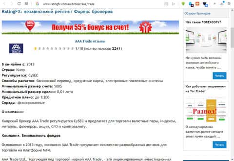 На портале ratingfx предоставлена статья о диллинговом центре АААТрейд, где разбираются все мошеннические схемы и недостоверная информация. Также на странице данной статьи можно написать комментарий-отзыв к нашему брокеру и поставить рейтинг конторы от 0 до 10 звёзд. Рейтинг неутешителен. Проголосовав 2000 человек, был поставлен средний рейтинг с 1 звездой.Wikifx о кипрской компании АААТрейд с множеством информации