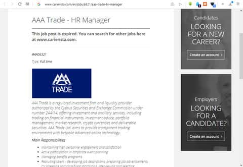 На carierista размещена вакансия, на поиск HR manager'а для главного офиса на Кипре мошеннической конторы АААТрейд, который будет искать персонал, подготавливать отчеты, работая на полную ставку. Зарплату предлагают очень высокую, это и понятно, всё-таки там сворованные деньги делятся, а не заработанные честным трудом. Только адрес офиса находится по другому адресу.АААТрейд заманивает к себе студентов, чтобы они воровали для них деньги