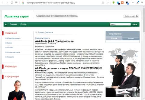 Компания ААА Трейд - это очередной брокер на валютном рынке форекс, который, как мы думаем, спекулирует волшебными мифами. С тем чтобы "волшебство" продавалось с успехом - требуется раскрутка. Доверие лохов - без этого результата не будет. Чувство доверия лохов, которые в ближайшем будущем потеряют свои сбережения в AAATrade, создается заголовками типа: "РЕАЛЬНЫЕ МНЕНИЯ об AAATrade".