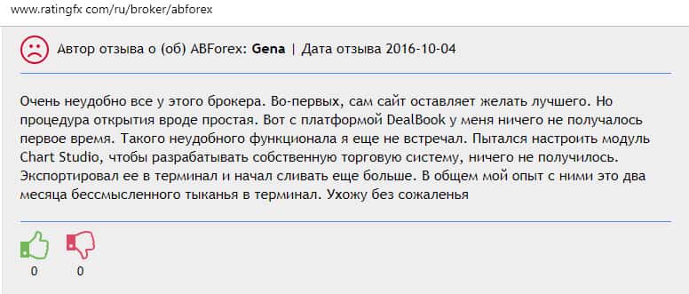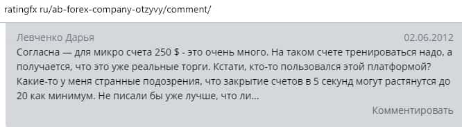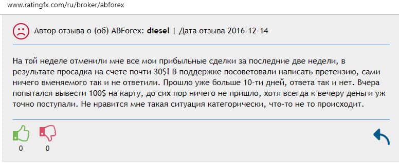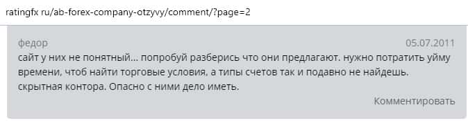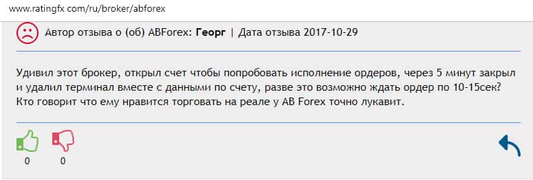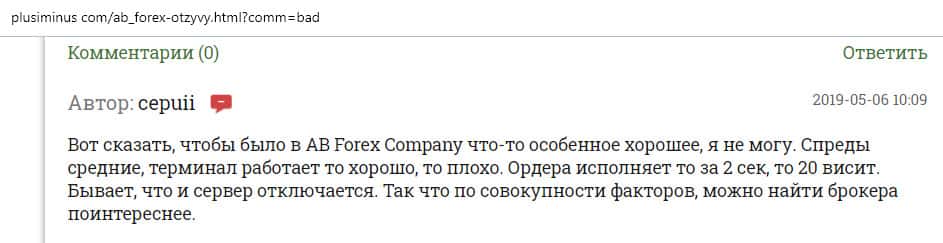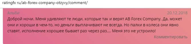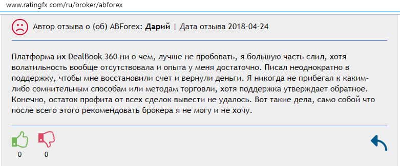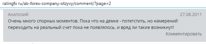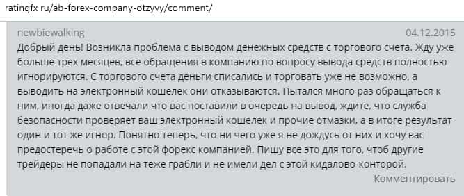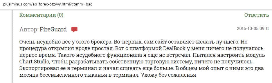 Далее представлен отзыв от одного бывшего трейдера конторы AB Forex, который на своем горьком опыте понял, чем заканчивается такое сотрудничество. Тем более, что у них много чего не работает в торговой платформе, так как должно быть, а соответственно лучше выбрать другого брокера для того чтобы торговать на рынке Форекс.