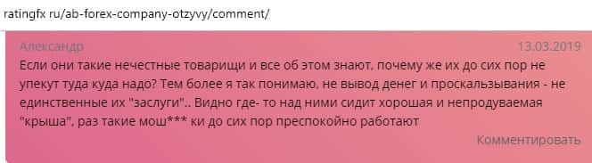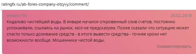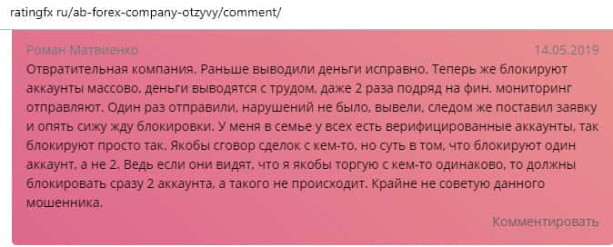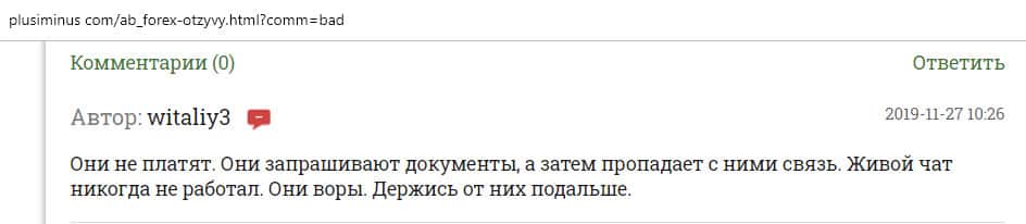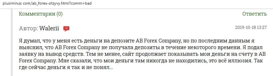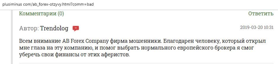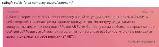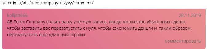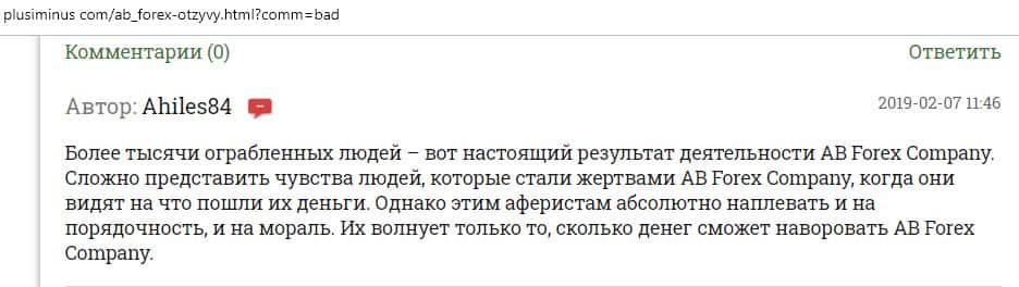 По словам автора следующего отзыва, он имел довольно неудачный опыт сотрудничества с конторой AB Forex. Он вложила все свои сбережения в эту компанию, потому что его убедили в гарантии прибыли. Но весь счет был слит и теперь лохотрон АБ Форекс ищет крайнего в своих косяках. Бывало что они даже обвиняли жертву в их бездействии.