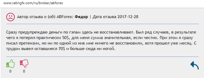 На изображении, указанном ниже, можно ознакомиться с негативным отзывом очередного недовольного клиента воровского форекс брокера AB Forex, которые тупо морозится от жалоб пользователей. Лично он потерял 120$ из-за того что внезапно появляются гэпы, которые обычно приводят к полному уничтожению счета.