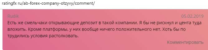 По словам еще одно человека, который по своей глупости открыл счет в кухне AB Forex и вложил туда деньги, очень сожалеет об этом, так как заблаговременно не усмотрел все недостатки организации. Сайт криво сделан, глюченная торговая платформа и проблемы с выводом - это основные пункты, согласно которым, жертва ушла из конторы АБ Форекс.