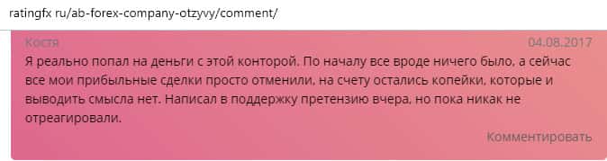 По словам автора отзыва, дилинговая контора AB Forex занимается мошенничеством, при чем открыто все это делает. Аферисты заинтересованы в том, чтобы клиент смог потерять как можно больше денег в процессе торговли. В данном случае жулье АБ Форекс отменили прибыльные сделки клиентов и на счету остались копейки, которые они не хотят отдавать.