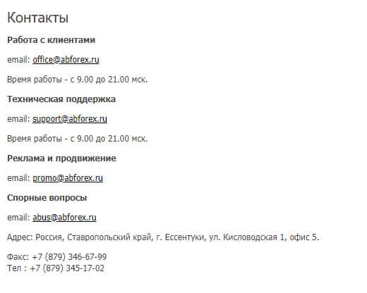 - электронные почты office@abforex ru и support@abforex ru и promo@abforex ru и abus@abforex ru