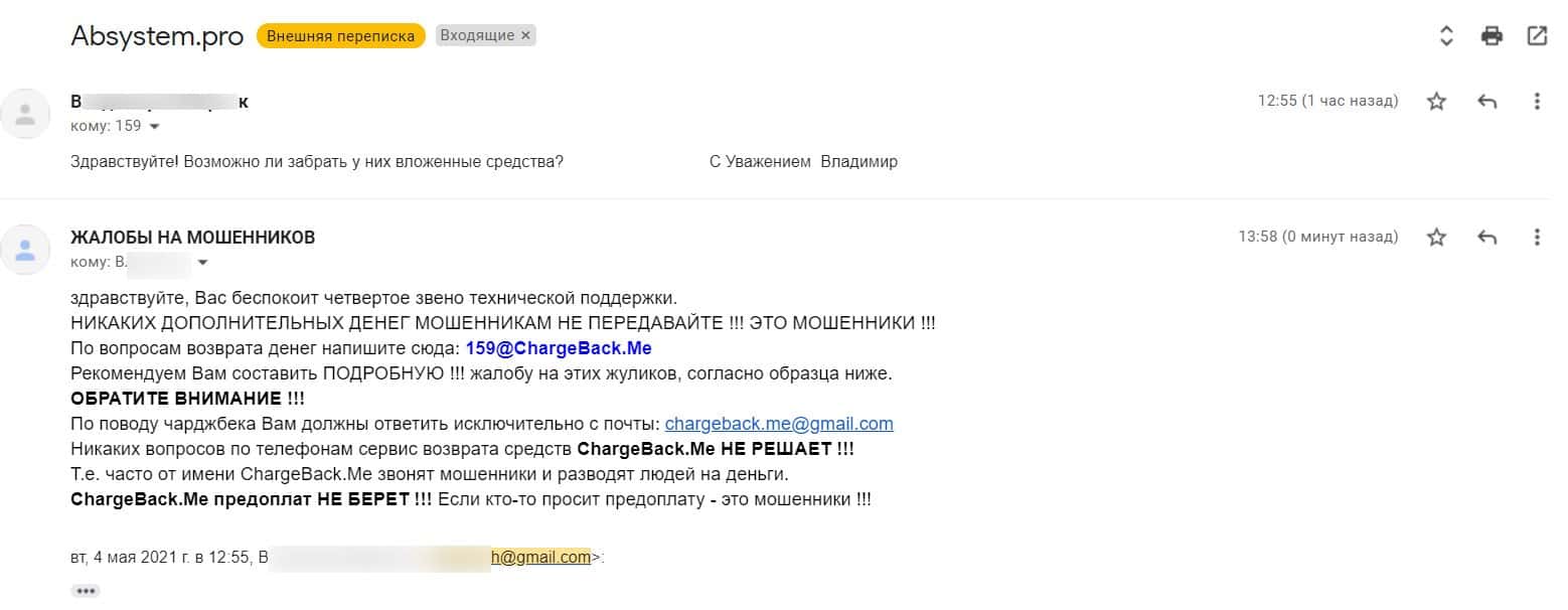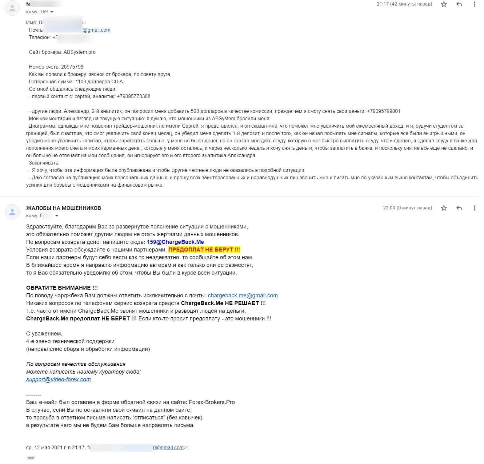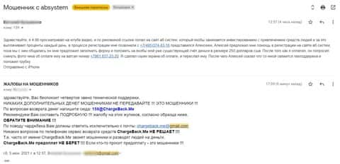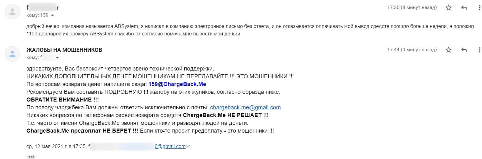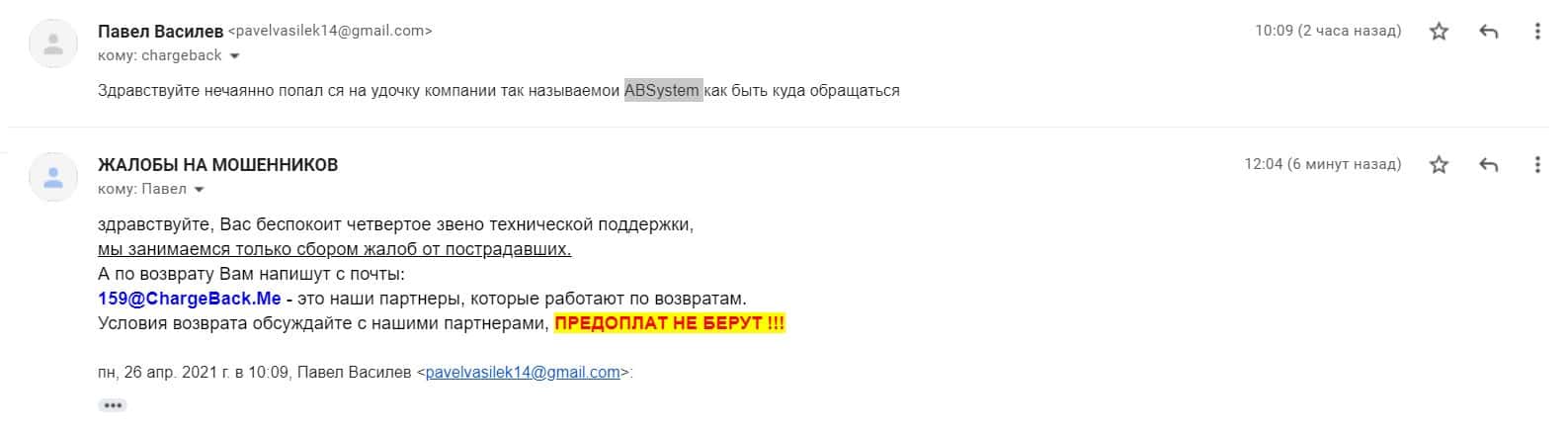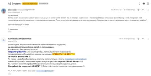 Так же разводилы ABSystem Pro указали контактный адрес электронной почты жуликов, но поддержка мошенников игнорирует своих клиентов, чтобы не выводить средства. Почта: