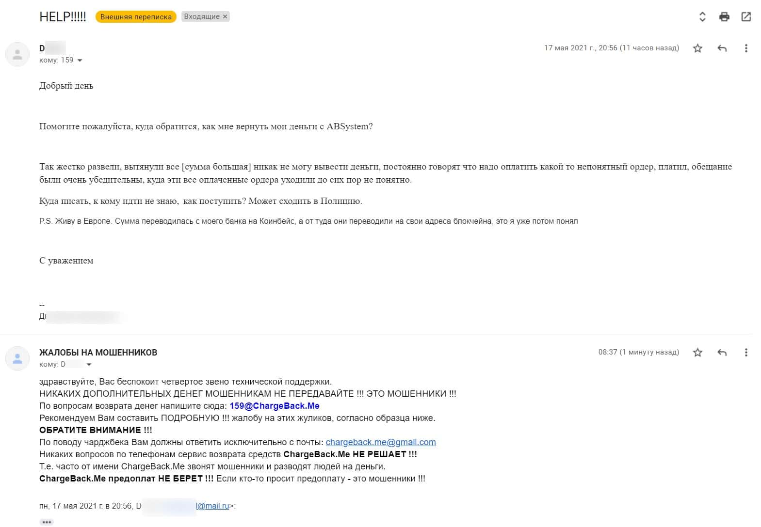 Далее предоставлена жалоба на лохотронщиков АБ Систем, которые совместно с аферистами Коин Базе кинули клиента на 13 000 евро.