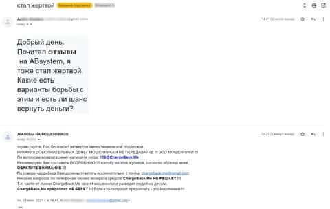 На емайл сайта-разоблачителя пришло письмо с жалобой от очередного обманутого интернет-пользователя, который столкнулся с мошенниками АБ Систем и утратил из-за них деньги.