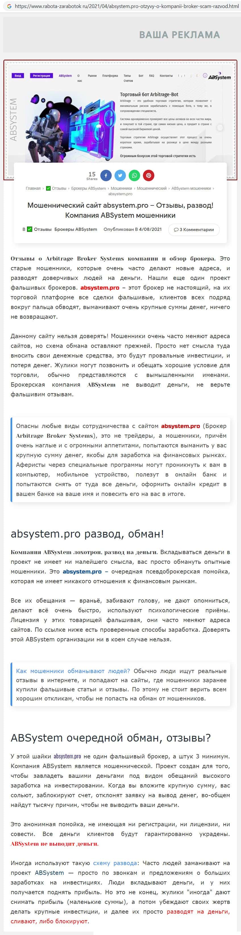 Интернет-ресурс rabota-zarabotok ru опубликовал статью о конторе разводил АБ Систем, в которой сообщил, что компания является мошенником, который не выводит средства.