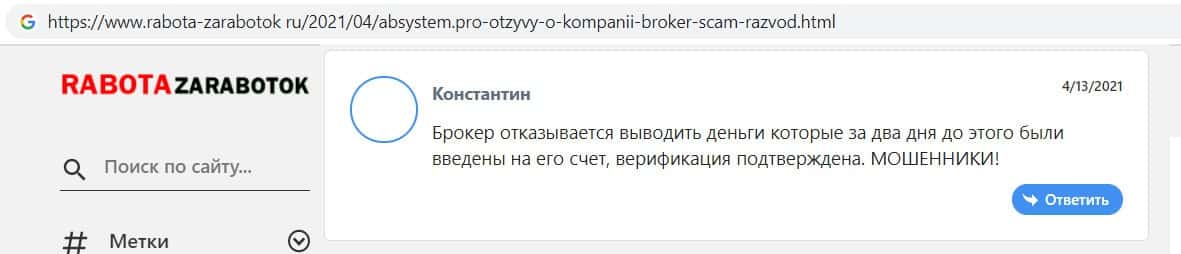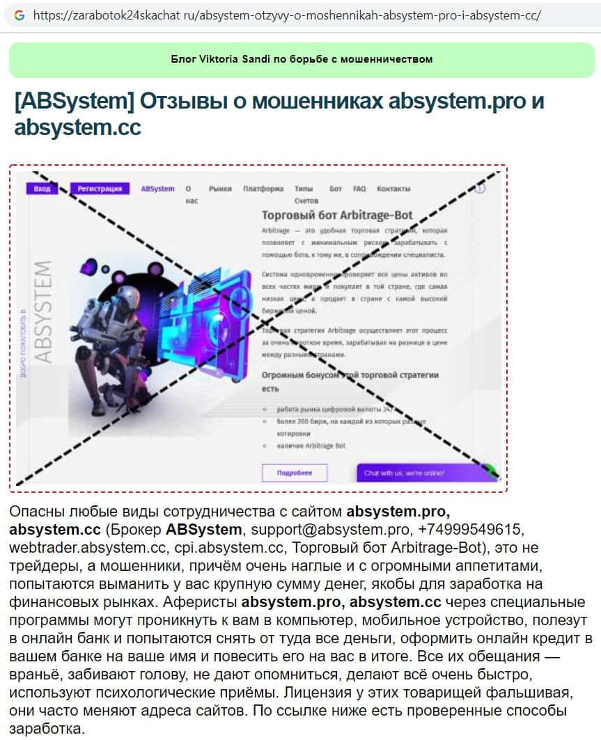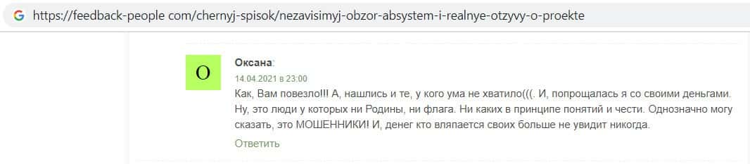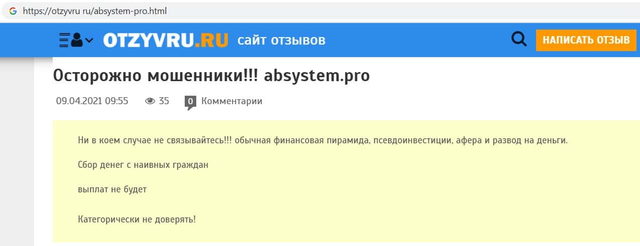 Своё мнение о компании ABSystem Pro опубликовал и сайт otzyvru ru, который призвал пользователей не сотрудничать с компанией, так как они мошенники и разводят пользователей.