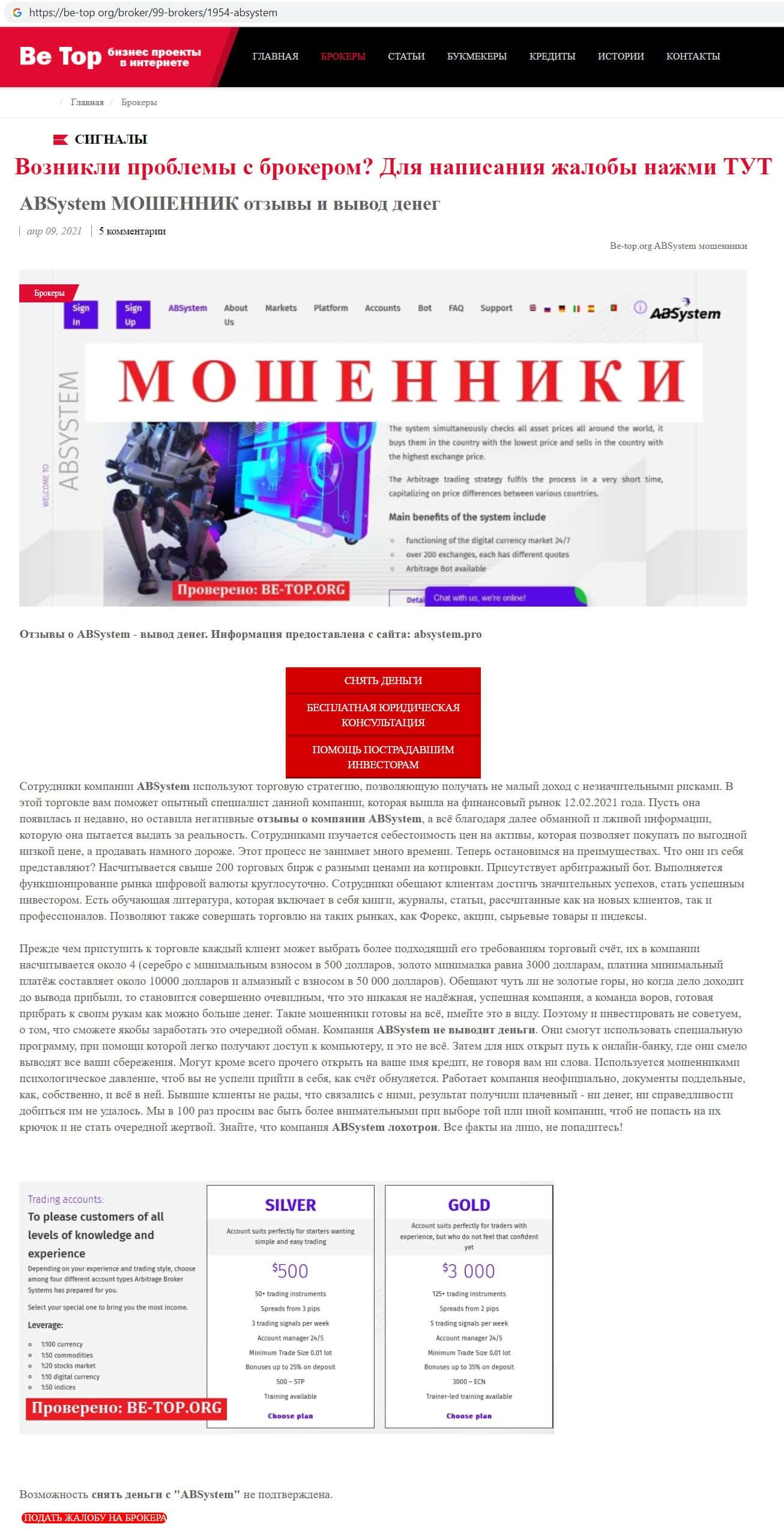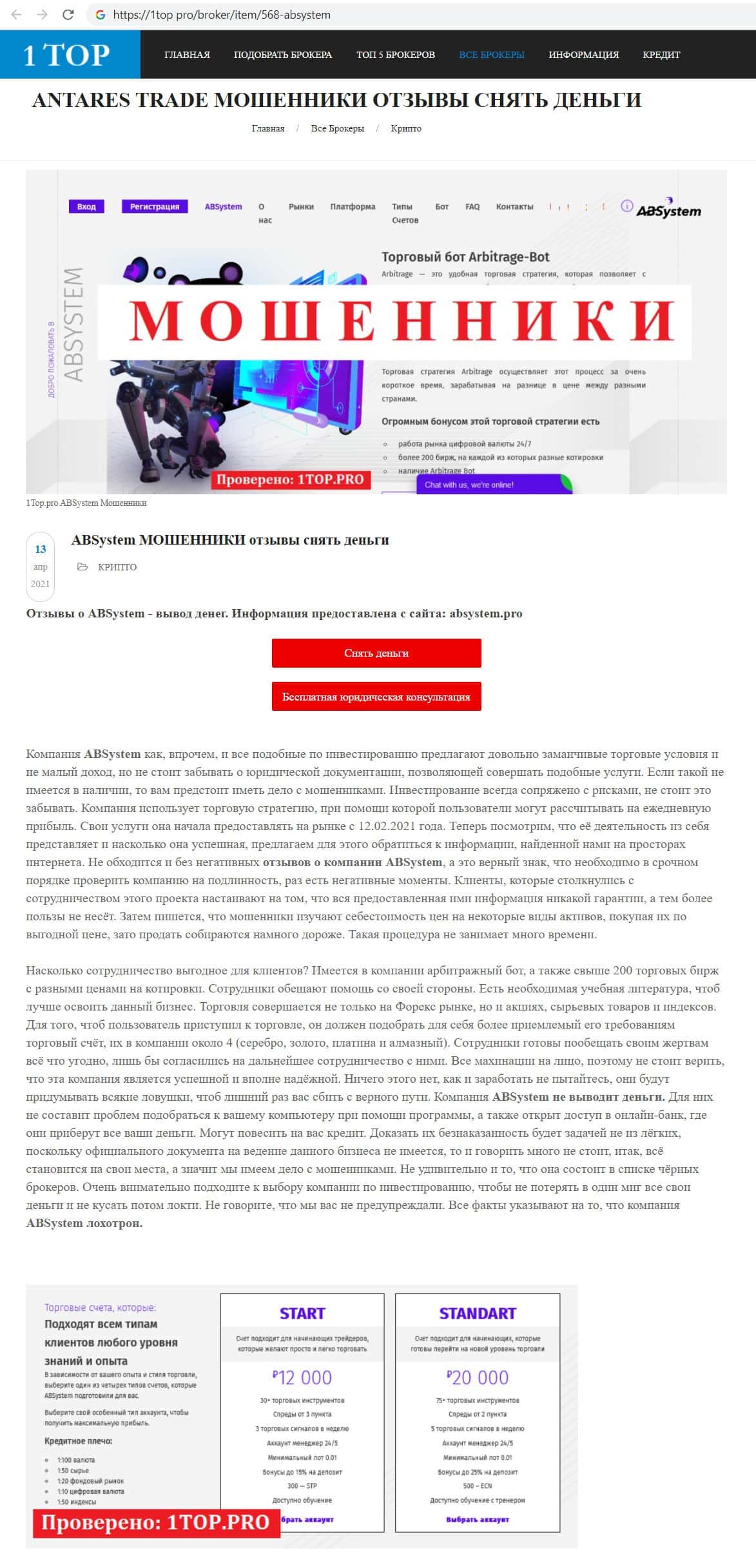 Веб-ресурс 1top pro так же не рекомендует сотрудничать с компанией ABSystem Pro, так как считает, что брокер занимается мошенничеством, что приводит к банкротству клиентов.