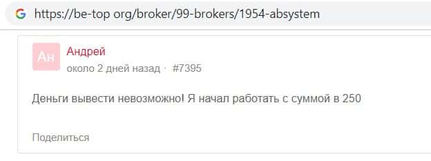 Ниже вы можете увидеть отзыв клиента компании АБ Систем, который сообщил, что инвестировал брокеру 250 долларов, но вывести свои средства больше не смог.