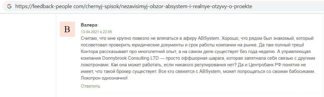 Онлайн-сервис feedback-people com опубликовал большую статью о компании АБ Систем, в которой сообщил, что с брокером опасно сотрудничать, так как эта шарага никем не регулируется.