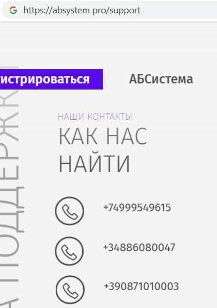 Контора кидал ABSystem Pro указала на своём сайте контактные номера телефонов, с которых администрация лохотрона звонит пользователям и заманивает их в ловушку. Номера: