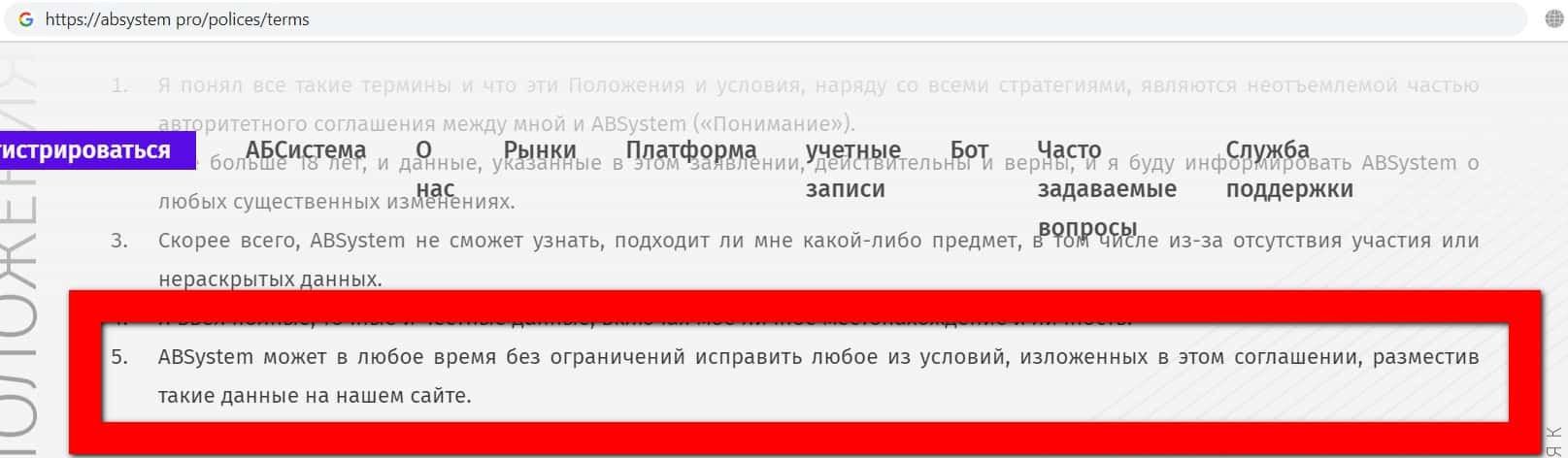 Компания махинаторов ABSystem Pro указала в своём соглашении пункт, согласно которому фирма имеет полное право изменять любой пункт своего клиентского соглашения.