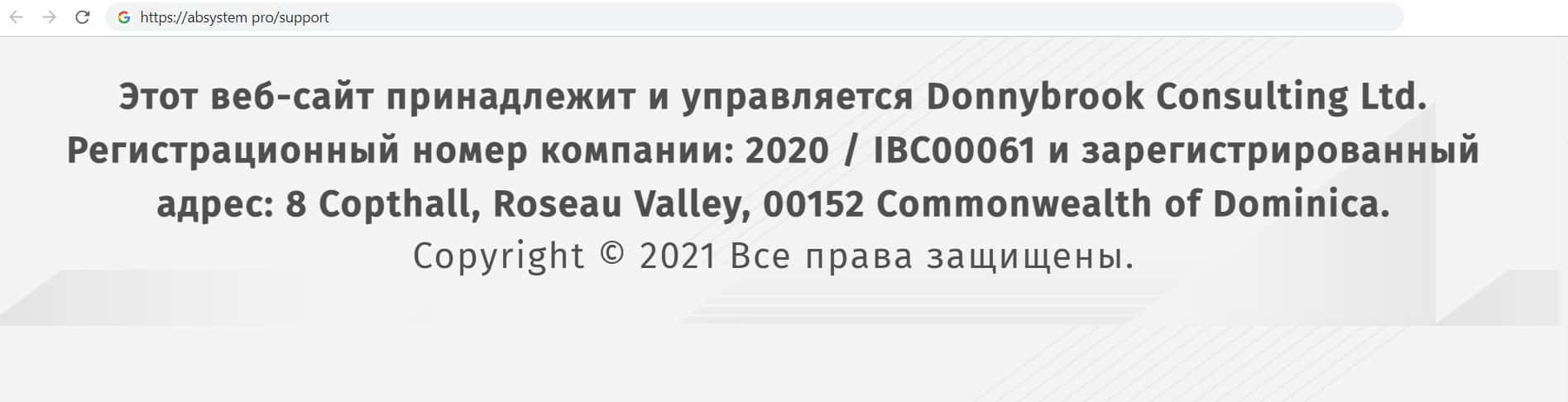Псевдоброкер ABSystem Pro указал на своём интернет-ресурсе информацию о своём юридическом лице, которым в свою очередь является компания Donnybrook Consulting Ltd.