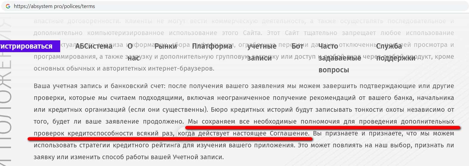 Так же мошенническая организация ABSystem Pro указала в соглашении, что имеет право проводить в любое время проверки кредитоспособности своих клиентов.