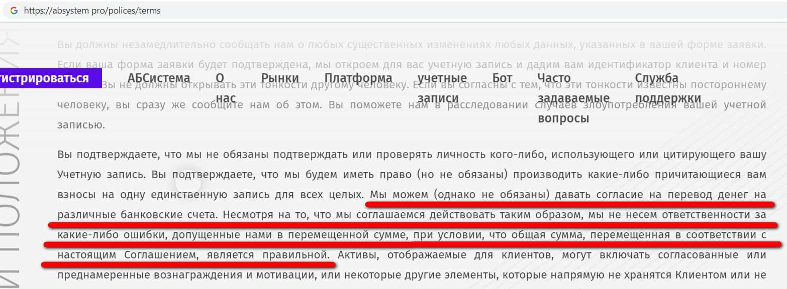Компания кидал ABSystem Pro так же указала, что даёт своё разрешение на перевод денежных средств. Но не несёт никакой ответственности за любые ошибки во время перевода.